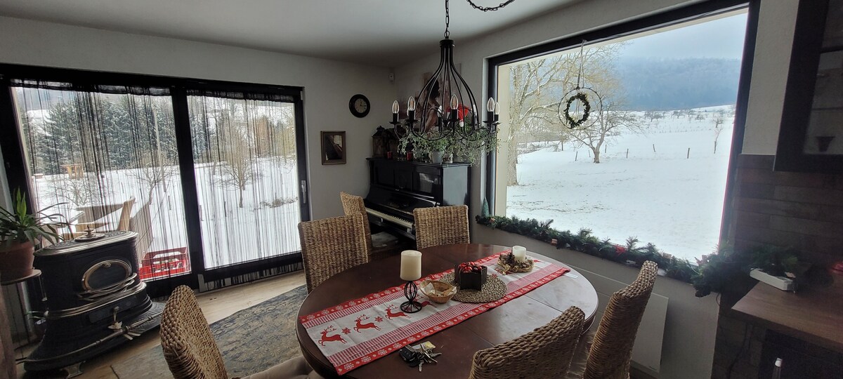 Entspanne dich mit der ganzen Familie, Freunden oder alleine in dieser ruhigen Unterkunft in einer sehr schönen Gegend im Jura mit mehreren kleinen Seen und Teichen im Umfeld. Im Winter locken Weihnachtsmärkte in Montbéliard, Colmar oder St. Ursanne in der Schweiz. Basel, Freiburg und Mulhouse, sowie drei Gebirge stehen zur Auswahl: Jura, Vogesen und Schwarzwald. Der Europapark Rust ist nicht weit entfernt. Highspeed-Internet ist vorhanden. Parkieren im Haus und in der Einfahrt ist möglich.