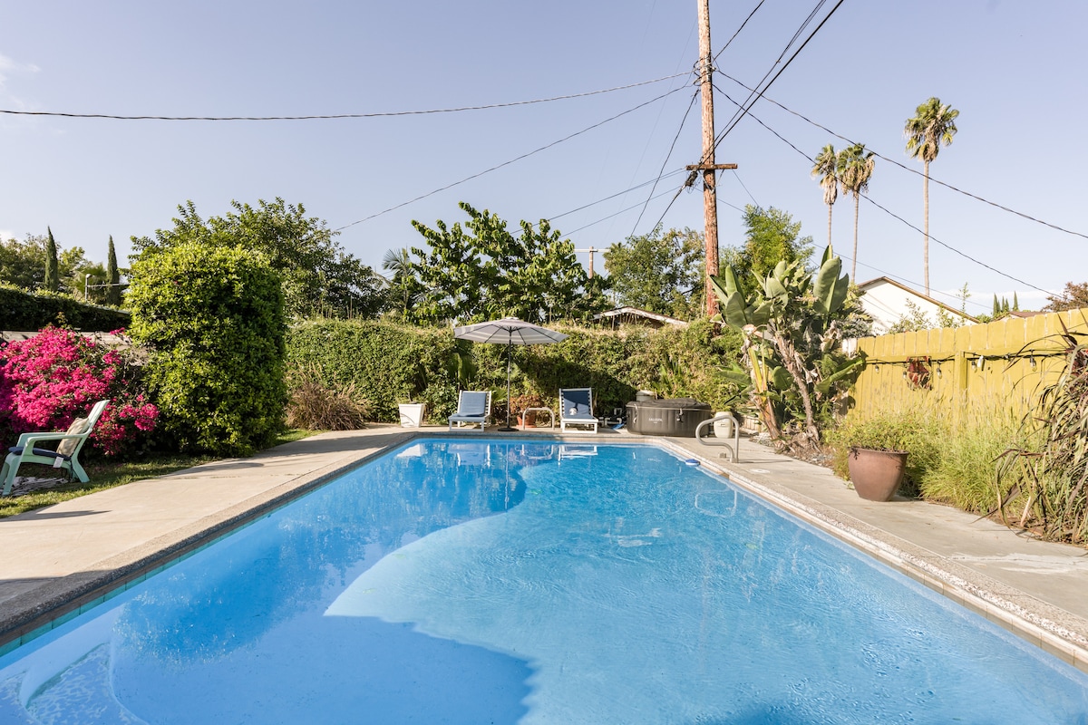 One-of-a-kind guesthouse wing with vintage 40’s vibe. Million $ views from every room. See video tour, google sydsfabulousguesthouse17 before booking. Hot celebrity hillside area is walking distance to great eateries, entertainment and shopping. Washer/Dryer in garage. Pool warm Mid June-October. You’re free to hang there. Property runs on 100% solar. EV charger available. Free 24 hour street parking. No tobacco smokers (weed ok outside). See House Rules. This is an amazing upscale property!
