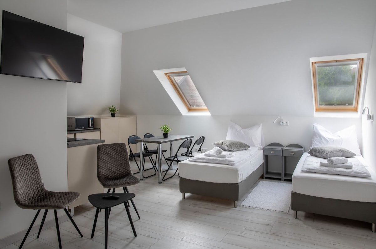 Our newly-built Comfort appartments are one-storey apartments, equipped with everything our guests might need for a pleasant stay in Veszprém. Thanks to their central location, all important sites can be reached from them easily and quickly - even by walk (Old Town Square: 3 min walk, Veszprém Castle: 6 min walk, Gyárkert: 10 min walk, Love Island: 6 min walk).