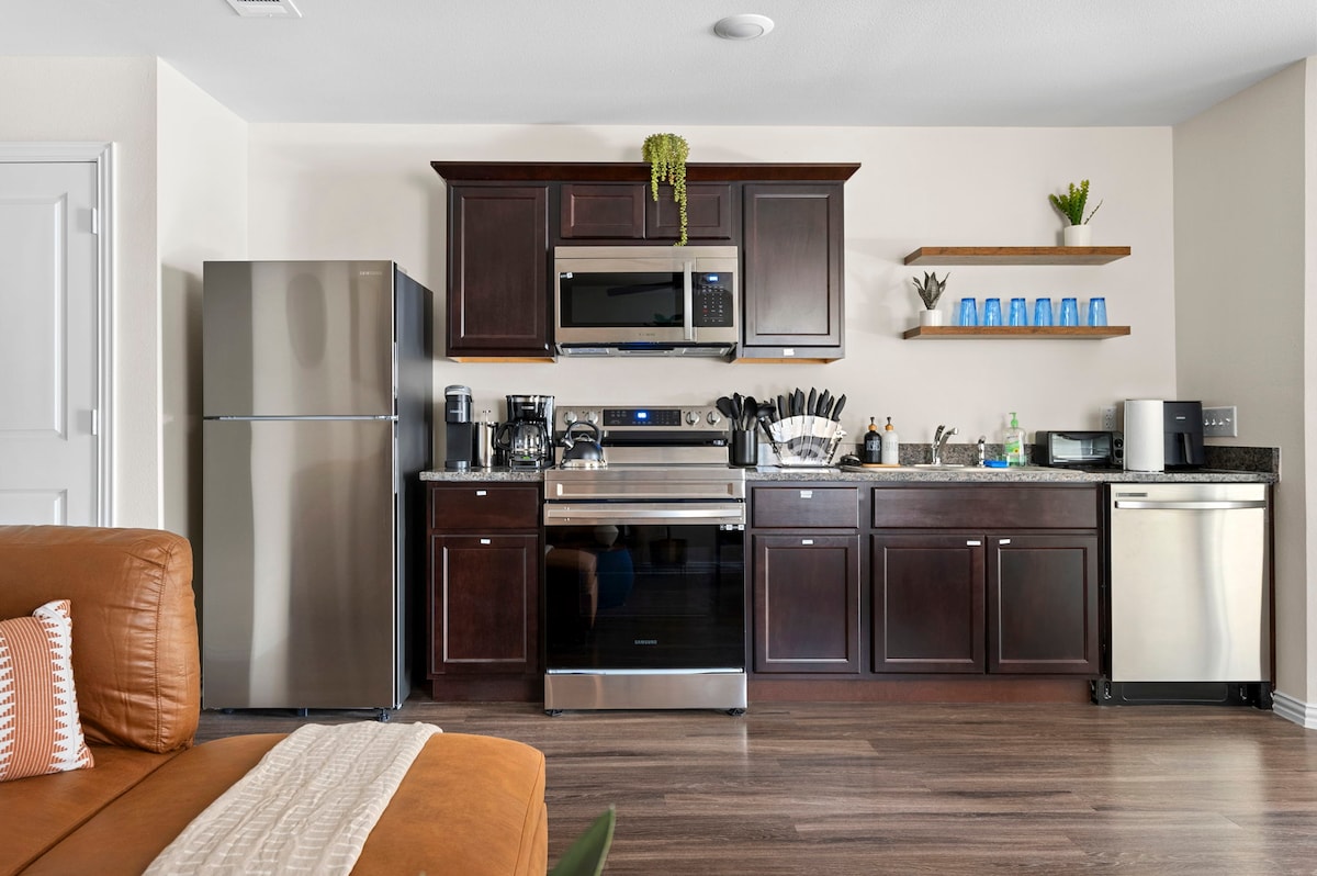 ✨Free Wifi ✨Free Coffee Bar ✨Free NetFlix/Prime Videos ✨Free Popcorn ✨Brand New and Modern Luxury ✨Free Backyard Games Step into an exquisite escape in this newly built 2050 SqFt home, perfect for families or corporate groups. With 4 generously sized bedrooms and 3 luxurious bathrooms,2 Car Garage, catering to your comfort. Featuring an open concept layout,Fully equipped kitchen,Coffee bar and a dining area for 8. A dedicated workspace, perfect for anyone seeking to blend work with relaxation.