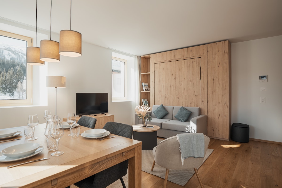 Resort with 83 apartments opened at the end of 2015. The 2½-room apartment has 1 bedroom with 1 double bed and 1 sofa bed for another 2 people in the living room, toilet/shower with glass wall, 2 flat-screen TVs, free Wi-Fi, fully equipped kitchen, balcony. The beds are made on arrival, and shower/hand towels are available. Unlimited access to Pradas Oasa (500 m²) and the kids club. In summer, mountain railways, mini-golf, swimming lake and various museums included. Right on Brigelser swimming lake.