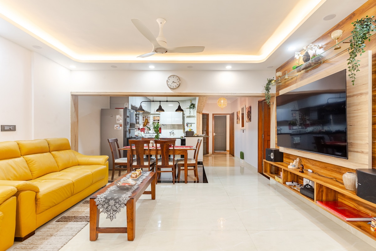 A modern home with warm wooden accents and cozy décor. Enjoy a stylish studio with plenty of natural light. Located in a central neighborhood with comfortable living area, modern furniture and private terrace. Perfect for solo traveller, couple or small families looking for comfort and convenience. Neighborhood Highlights: 🌿 Situated in a safe residential area with easy access to local market 🛍️ Close to WTC, ORION Malleswarma, ISKCON, Kuvempu metro station 🚙Well connected to main road.