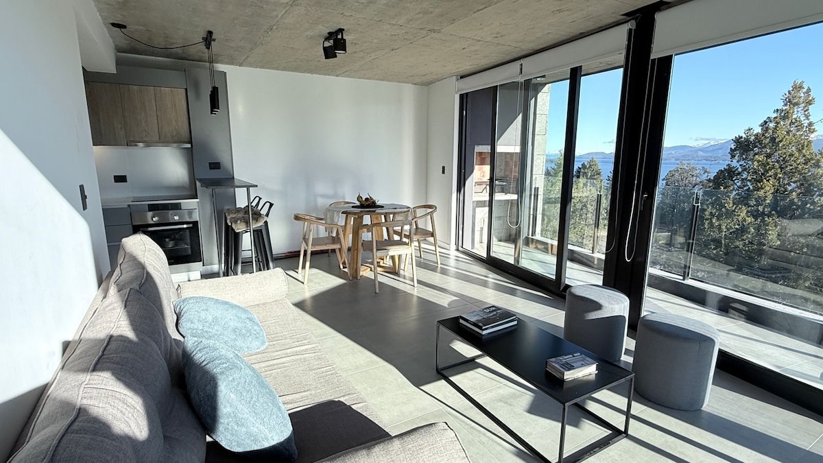 Spectacular brand new apartment facing Lake Nahuel Huapi. Excellent location, on one of the city's main avenues, seven kilometers from downtown and Cerro Catedral. In a unique setting and with an unbeatable view of the lake and its islands. Fully equipped apartment for six people. Three bedrooms, two full bathrooms, two toilets, kitchen, living-dining room and large balcony. Terrace with grill and whirlpool for four people. A heated pool in summer.