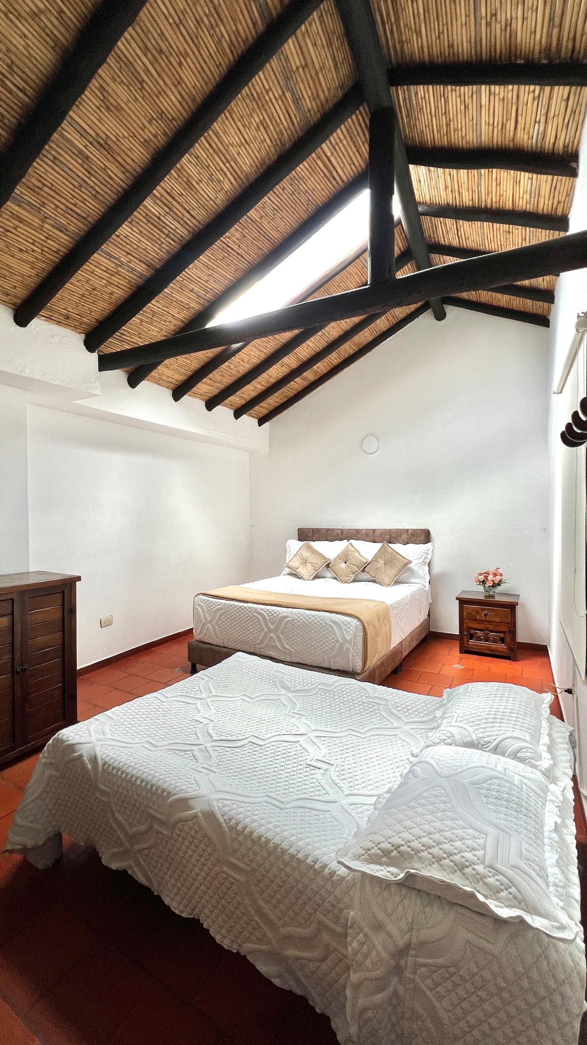 This cute room is located at Casa Pancha Mama with a great location just two blocks away from the main square. It is ideal for a couple to spend a few romantic days exploring the charming Villa de Leyva. It is spacious and cozy equipped with a double bed and a full banio . The room has a beautiful view of the house's patio and mountains. A delicious breakfast is included in the room rate.
