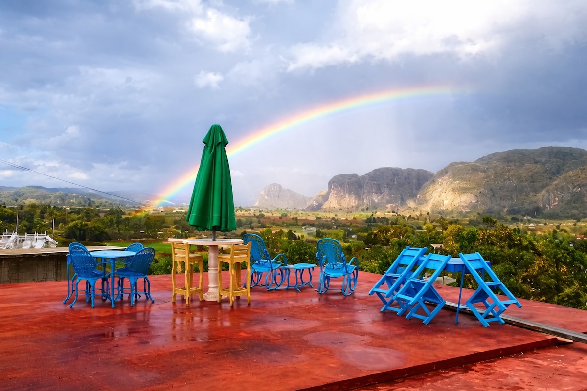 LOOK NO FURTHER, YOU'VE FOUND PARADISE. A UNIQUE COUNTRY HOUSE ACCOMMODATION, WITH A PRIVATE ROOM. A TROPICAL ENVIRONMENT AND A FAMILY ENVIRONMENT THAT WILL MAKE YOU FEEL AS IF YOU WERE IN YOUR PRIVATE HOME. VIEWS OF THE VALLEY FROM ALL CORNERS OF THE TERRACE. ALL KINDS OF IDEAL EXPERIENCES FOR HORSEBACK RIDING OR WALKING THROUGH THE VALLE DE VIÑALES, TRIPS TO OUR BEACHES, BICYCLE TOURS, BREAKFAST, DINNER, RUM, TOBACCO, AND TRADITIONAL DRINKS.