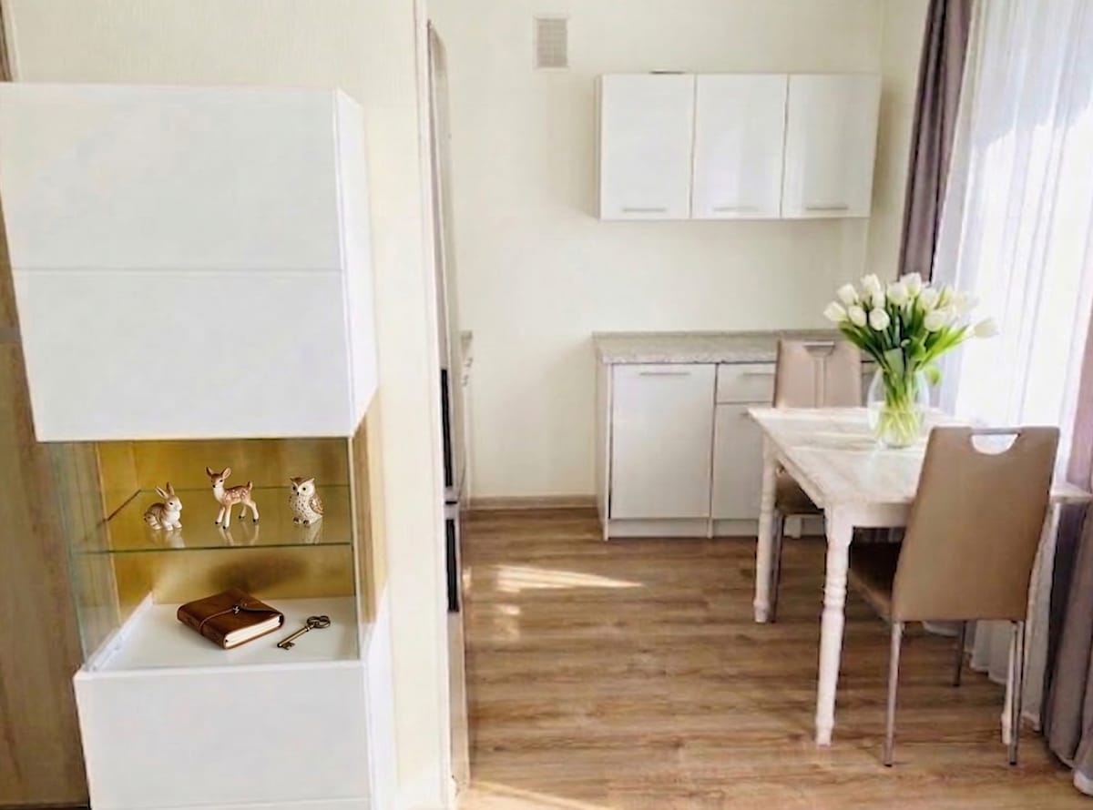 Cozy sunny apartment in the city center with a wonderful forest and lake view. Enjoy the elegance of the Scandinavian interior with beautifully decorated brand-new furniture. Perfect for holidays and remote work. Free parking and self check-in/check-out. Shops are only a two-minute walk away. The apartment is sunny and very warm. Perfect for up to 3 people. Equipped with a fan.