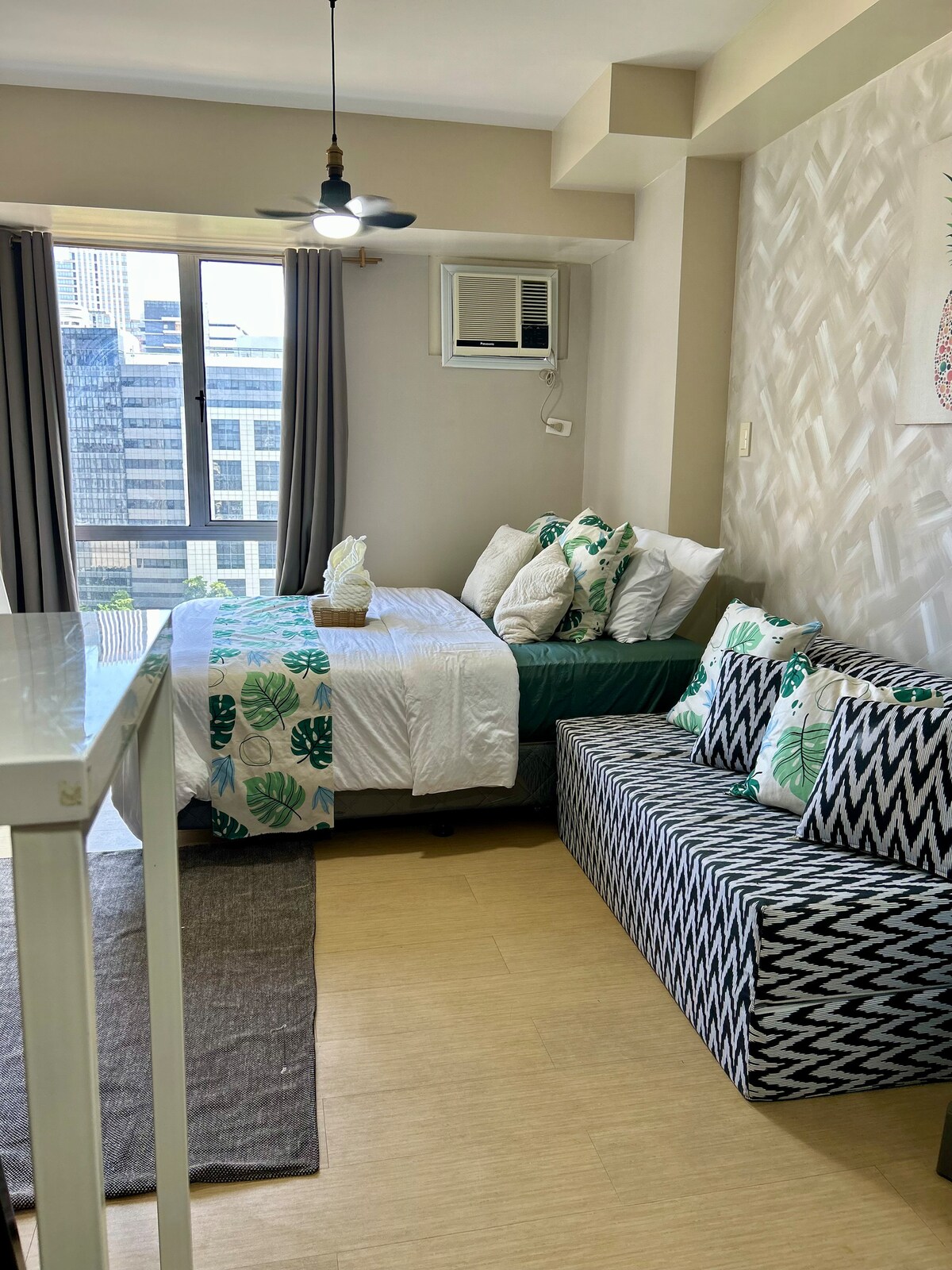 Stay in this charmingly stylish studio condo that is fully furnished and tastefully decorated with fine art selections. This stylish place is close to must-see destinations of Cebu City and Mandaue City. It is located near church, hospital, banks and just 30mins away from Mactan Airport and just 10mins from Ayala Center and SM City Cebu shopping malls. It has internet, double bed, ref, smart TV, workdesk, induction cooker, rice cooker, plates, mugs and utensils. Comes with towels and sheets.