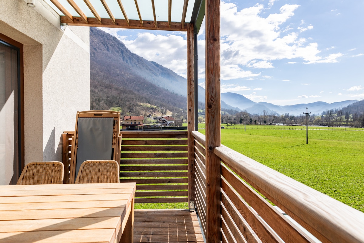 Newly renovated apartment carefully furnished to make your stay delightful. Situated in a little village just 5 min by foot from refreshing Soča river. Besides the usual amenities apartment offers AC, washer and dishwasher and more. Spacious terrase offers capturing views of the Valley and makes for a great space to enjoy breakfast or drink a glass of wine in the evening. There is one bedroom with its own toilet, sofa uses modern mechanism to transform in bed with its own matress in 10 seconds.