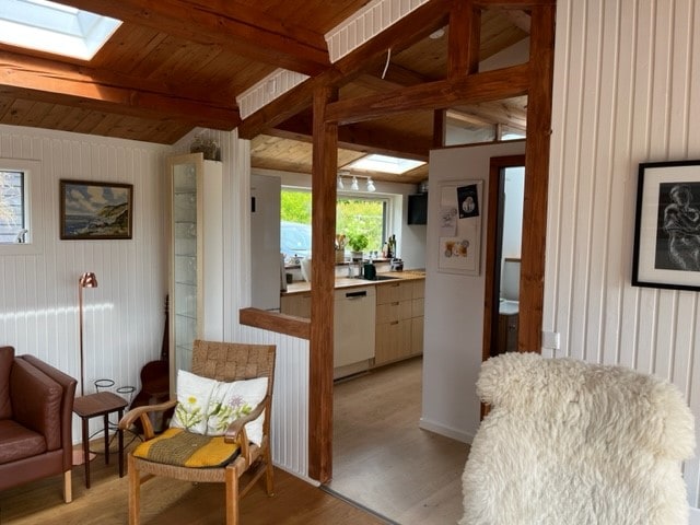 Roomy black loghouse with white windows and classic Danish design furniture. Master bedroom and 2 chambers all with comfortable beds. Renovated and updated in 2020-2025 incl. kitchen and bathroom. Nice garden with lawn ideal for croquet or even golf training (putting)!. Dishwasher and TV. Wi Fi. Nespresso Pixel coffee machine for capsules. Outdoor facilities for cleaning of newly caught fish.