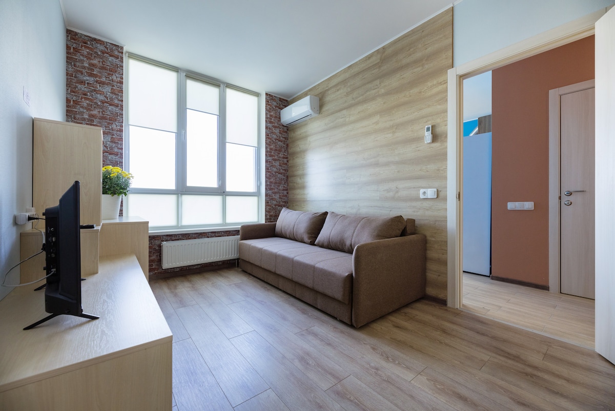 A bright and modern 35 sq.m. studio is located in a quiet area of the city within walking distance from transport hubs. The spacious room combines a seating area with a comfortable sofa, an equipped kitchen with modern appliances, including a refrigerator, a hob and a microwave. The bathroom with a shower cabin is designed in a modern style. The apartment has Wi-Fi, TV and air conditioning for a comfortable stay. Cafes, shops and parks are within a walking distance.