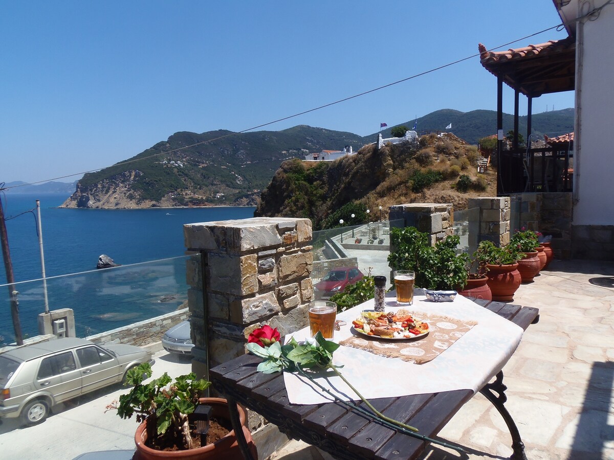 A fully equipped cottage house located on the beautiful village of Glossa with stunning view of the Aegean Sea and the amazing sunset! Suitable for easy living vacation! Furniture and decoration is made from natural materials creating a carefree atmosphere . The position of the house at the end of the village, in a quiet area, makes your stay relaxed. At the same time you are 10 min. away (walking distance) from market place,small shops,bakery,restaurants,coffee shops and bus station.