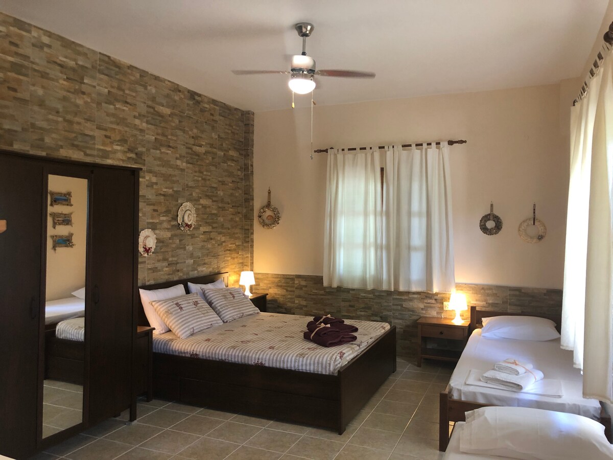 You wake up, the sun is rising behind mount Athos. You enjoy a cup of coffee, while the dolphins jump on the horizon. You walk to the beach and the only thing you can hear is the sea. You cook outside, watching the boats passing by and the seagulls chasing the fish. Now, it's time for drawings and board games. Finally, you have a glass of wine, waiting for the moon to rise behind the hills.