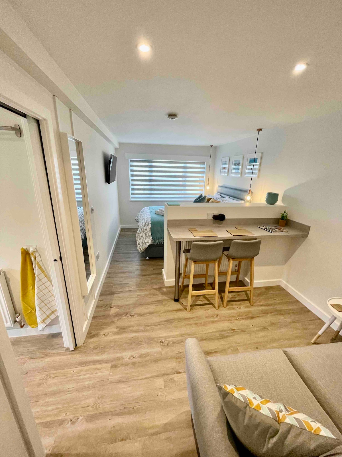 A lovely contemporary studio first-floor apartment, close to the centre of Wadebridge and famous Camel Trail. We are in a private lane, with off-road parking. A very comfortable space with a king-size bed and ensuite bathroom with a luxury walk-in shower. Your own balcony facing S.W. Leather sofa to watch Smart tv with Netflix/Amazon Prime included that you can watch from the sofa or spin to watch in bed. Kitchen area, toaster, kettle, fridge, microwave and cafetiere.