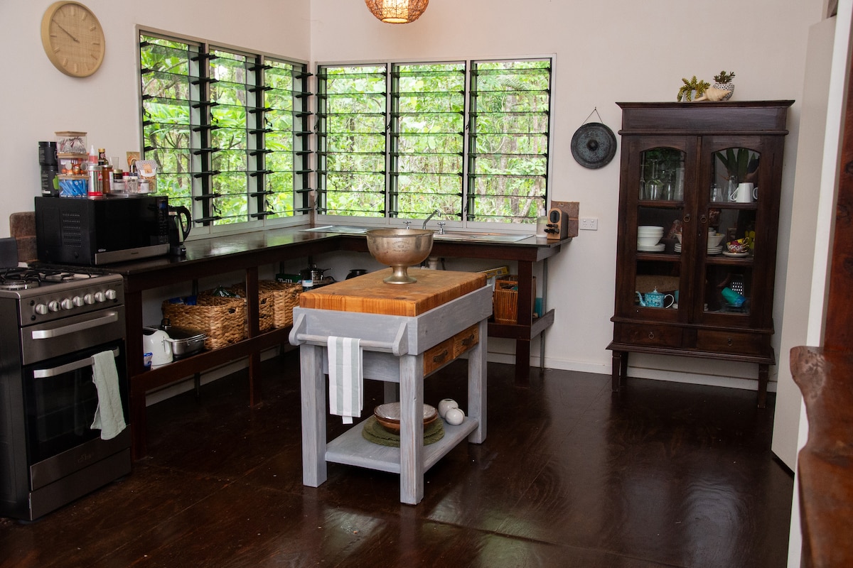 Enjoy this original Bali Bungalow with ensuite nestled in the back corner of our family’s tropical garden. It offers a simple double bed, tea/coffee making facilities, fridge, microwave and deck. A large swimming pool, outdoor kitchen, laundry and various sitting areas are available to share. We are close to everything - foreshore, markets, buses etc. You will easily be able to soak up every sunset possible during your stay! (Please note: kids share the outdoor space & NO tv or wifi provided)