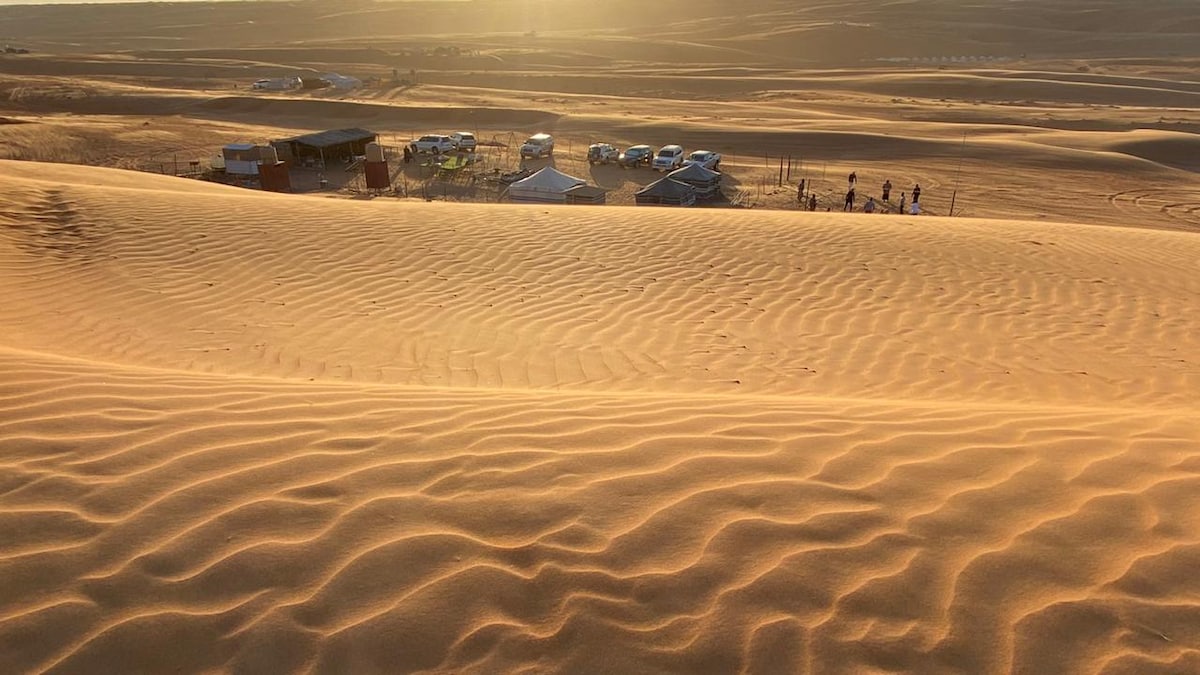 A quiet camp located on top of the sand dunes. It is characterized by the charming tranquility that the desert is famous for. You can watch the sunset and sunrise from your room, and you can see the stars. There is complete privacy. The price of accommodation includes dinner, breakfast, transportation from your car to the residence, and a short tour inside the desert and watching the sunset from Top of the sand dunes