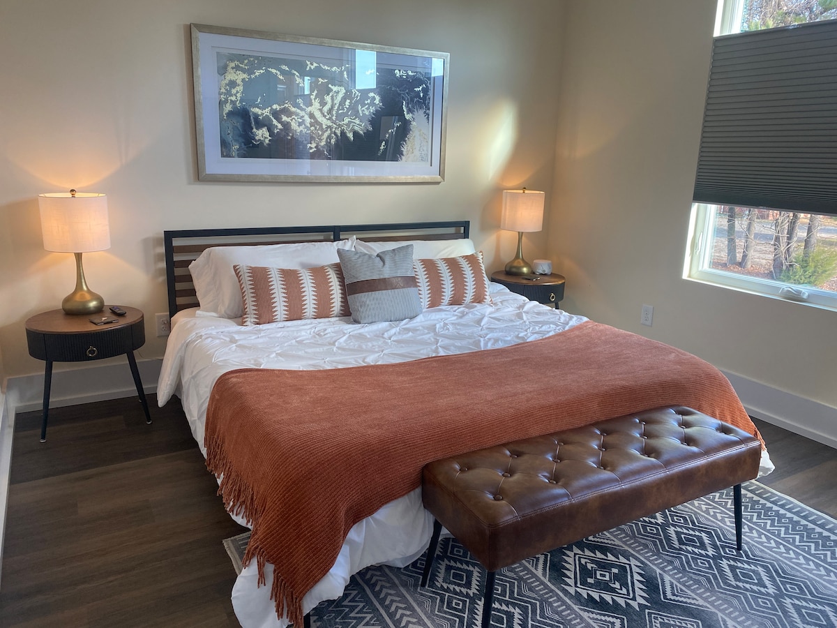 Centrally located in Holly Springs, Waterfront Wonder is the perfect spot for a weekend away or for checking out the RTP area! Tranquil, lake views tempt you to rock away the day in the hammock, fish, kayak or enjoy a game of bocce. Let your pets and kids stretch their legs in the large, fenced yard and spend your nights curled up the fire. The house was designed with both short and long term guests in mind, providing all the essentials and amenities (and some you didn’t know you needed!)