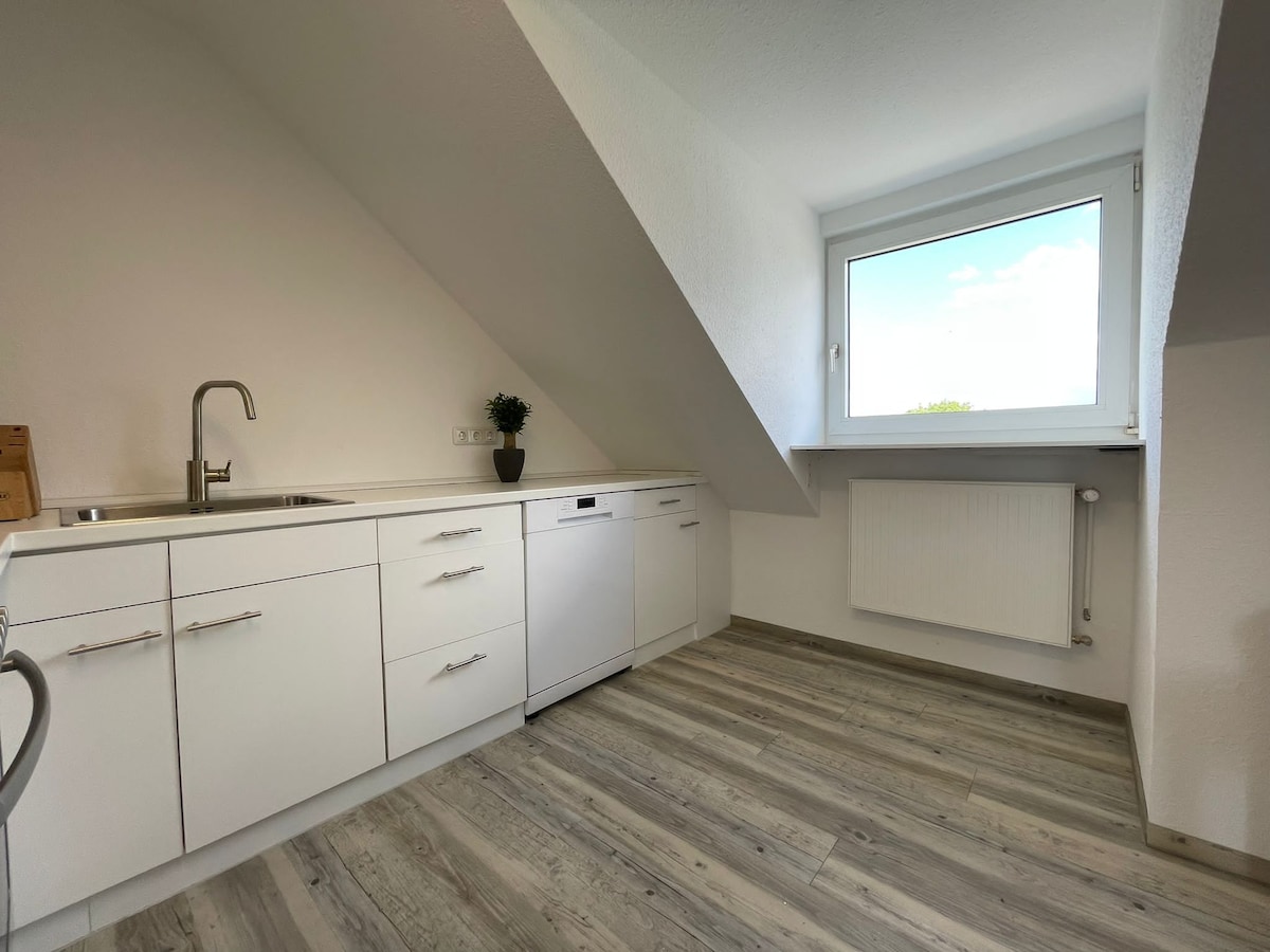 Modern, newly renovated 80 sqm apartment with balcony and unique views: The apartment is in the Marbach district. The city center is a 15-minute walk. It is located right on the edge of the forest and invites you to relax after a visit to the historic, lively Oberstadt. The apartment is fully equipped with high-quality and modern amenities (not barrier-free). It has one bedroom, one bathroom, a storage room and an open living-dining area with large window front.