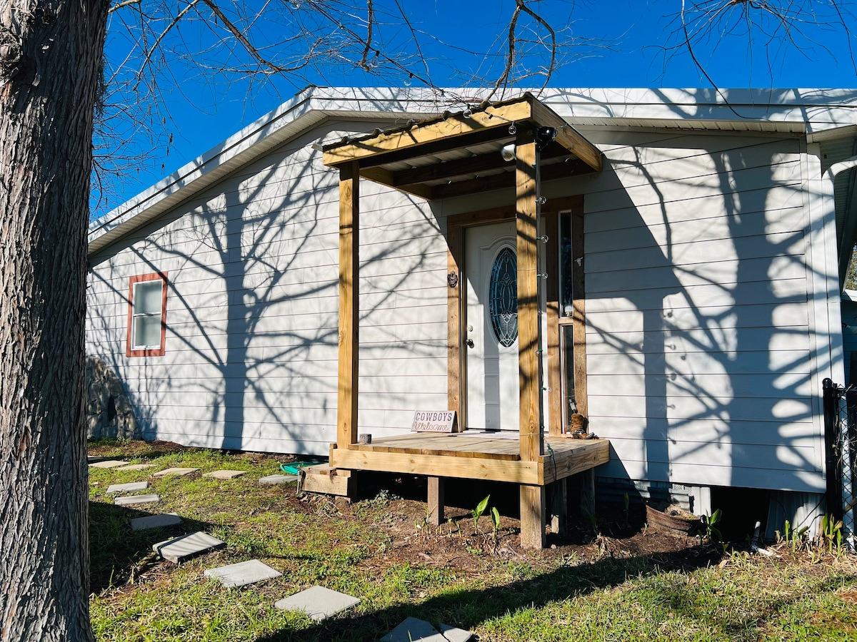 The simplicity & relaxation of our premium 399 Sq. Ft. tiny home is so refreshing and unique. This home sleeps four. It has a Queen size bed and a luxury pullout Queen sofa. The fully equipped kitchen is perfect to fix up your gourmet meals. The Bluebonnet is nestled beside our glistening 1/2 acre pond with ducks, fish and a fountain. A wooded area behind and open fields out front brings a nice breeze across the porch. Makes for a perfect place to enjoy the sunset & stars!