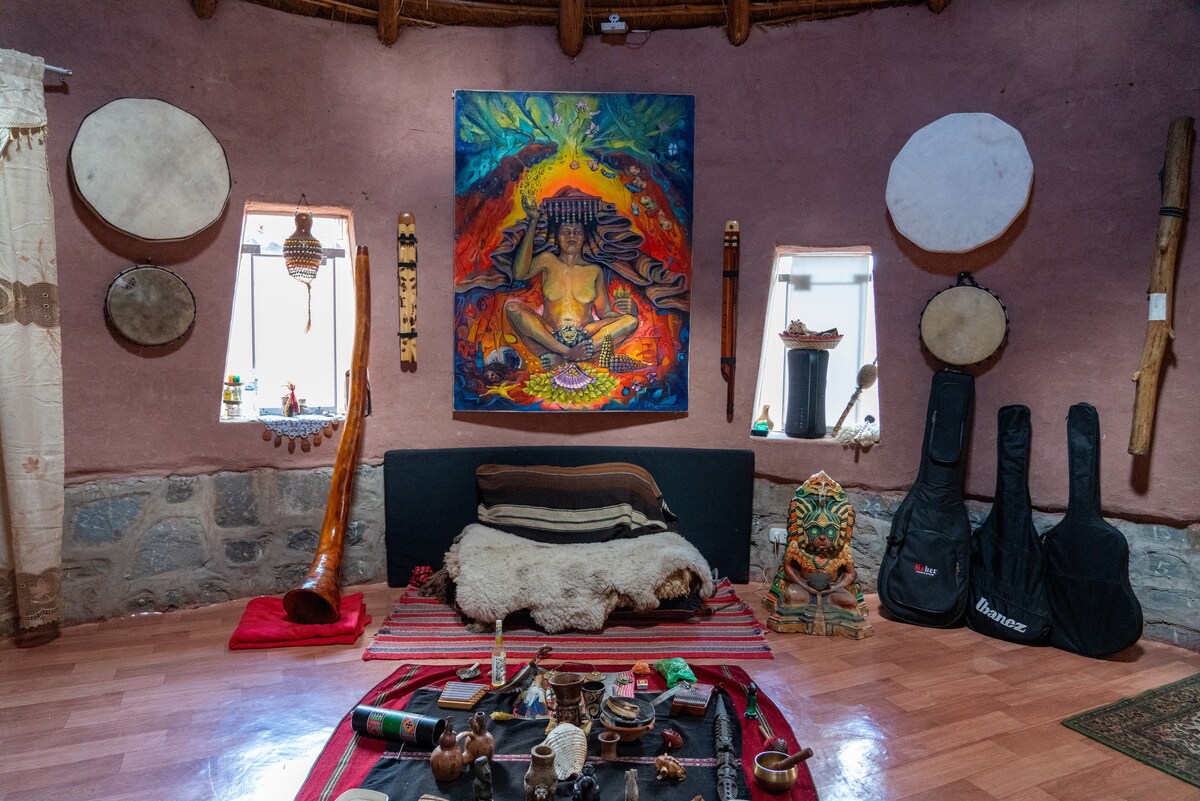 Rustic and independent house on 1,000 m², steps from the Temple of the Moon. It offers 2 bedrooms, 2 bathrooms with hot water, equipped kitchen, garage, work area, WiFi, grill and campfire area, living room, hammocks, space for temazcal and a private ceremonial temple. You will live with friendly alpacas with whom you can walk to the temple. Ideal for resting, meditating and reconnecting with Cusco's sacred energy.