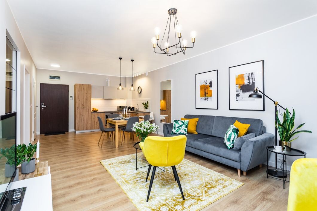 Przestronne klimatyzowane mieszkanie na 12 piętrze może pomieścić do 6 osób. Składa się z dwóch sypialni, salonu z rozkładaną sofą, aneksu kuchennego i łazienki z prysznicem. Mieszkanie oferuje przestronny salon z stylową sofą, telewizorem i balkonem. Wyposażone jest w niezbędne sprzęty kuchenne i łazienkowe, a także posiada bezpłatne Wifi i telewizor z płaskim ekranem. Kunsztowna kolorystyka w odcieniach szarości i żółtego podkreśla nowoczesny i przytulny charakter mieszkania.
