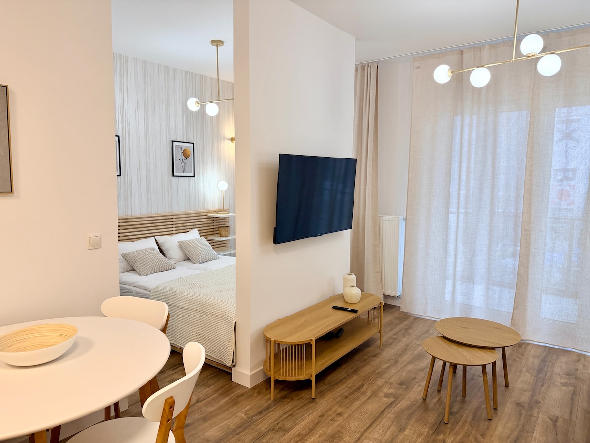 A spacious, over 50-meter apartment in a modern building in Mokotow, located on the 1st floor with a large, glazed terrace and air-conditioning. Our apartment consists of a closed living room with a foldable sofa bed, a bedroom with a double bed, a separate kitchen with a place to eat&work and a bathroom. The apartment is perfect for up to 4 people. Marina Mokotow is a prestigious neighborhood, great for both business travelers and families. Close to the Chopin Airport and bus stop.
