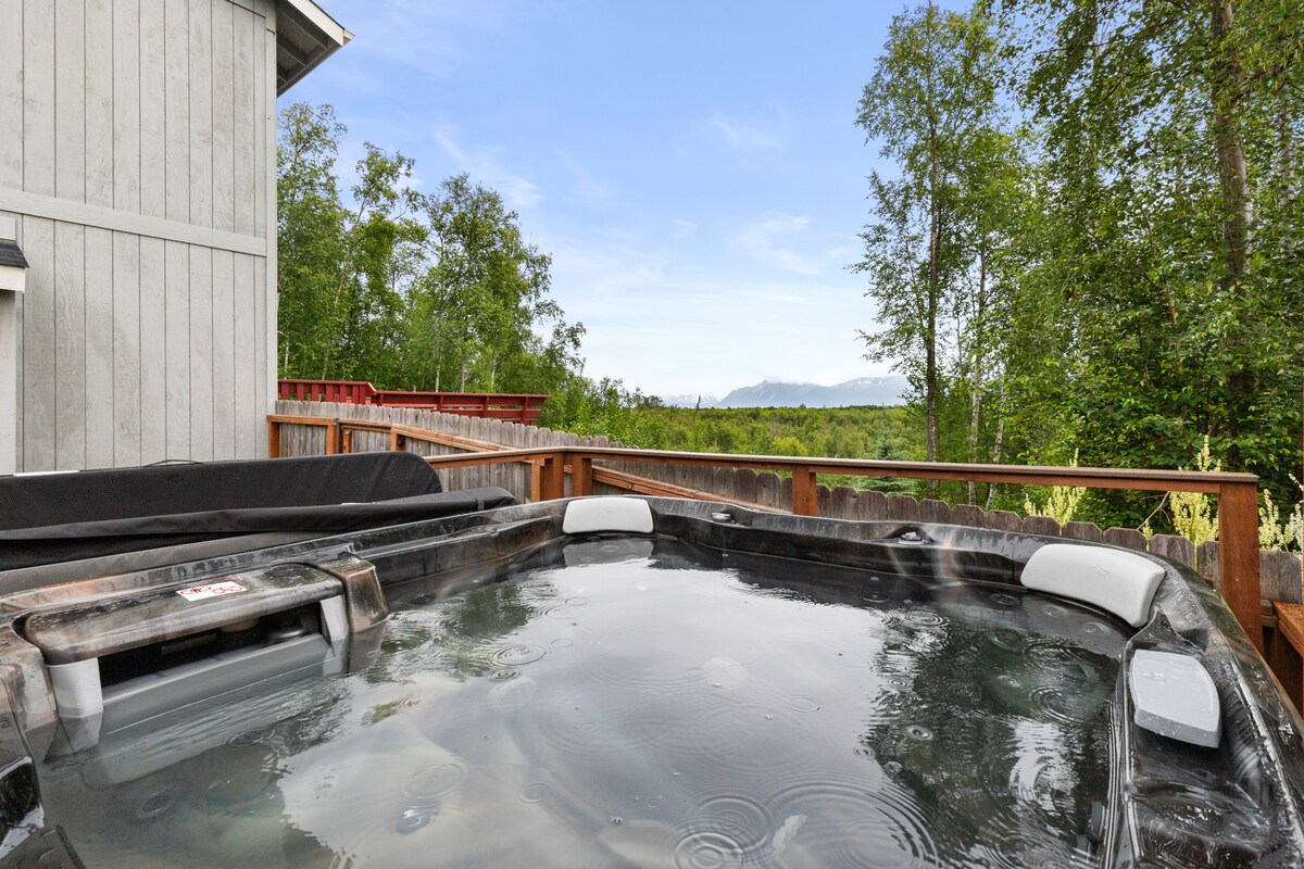 Escape to a beautiful Alaska retreat nestled on a bluff overlooking the majestic Talkeetna Mountains. This 2-acre property features a large deck with a 4-person hot tub and fire pit, perfect for unwinding at the end of the day. There are two comfortable bedrooms, each equipped with its own TV, and a spa-like bathroom for relaxation. There's a washer and dryer, so you’ll have all the comforts of home. Located near outdoor recreational spots like Hatcher Pass, this place is ideal for everyone.