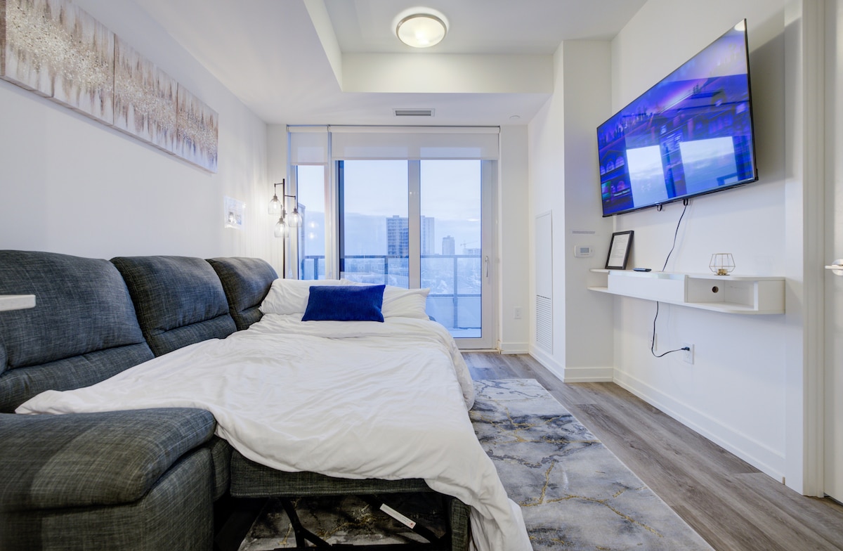 Welcome to our open concept highrise with city views in the heart of Kitchener-Waterloo, where style and comfort meet to create a truly memorable stay. This 1-bedroom open concept unit thoughtfully designed to accommodate up to 4 guests, making it perfect for couples, small families, or solo travelers looking for a modern and cozy retreat. ✔ Fully Equipped Kitchen ✔ Comfortable Bedroom w/ Queen bed ✔ Open Concept Living Area ✔ High-Speed Wi-Fi ✔ Free Parking ✔️Access to gym Learn more below!