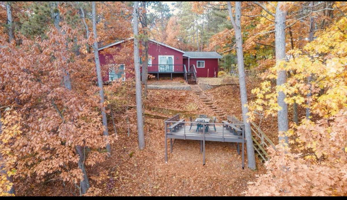 Come enjoy our cozy cabin nestled in the pines with frontage on a quiet lake. An all-season retreat: Kayak, fish, and swim from the dock during late spring, summer, and early fall. Boat and waterski during summer -it's a full recreational lake. Drive five minutes to Nordic Mountain - perfect for late spring, summer, and fall mountain biking or winter and early spring skiing and tubing. Enjoy the beautiful nature and lake views from inside the charmingly decorated home any time of year!