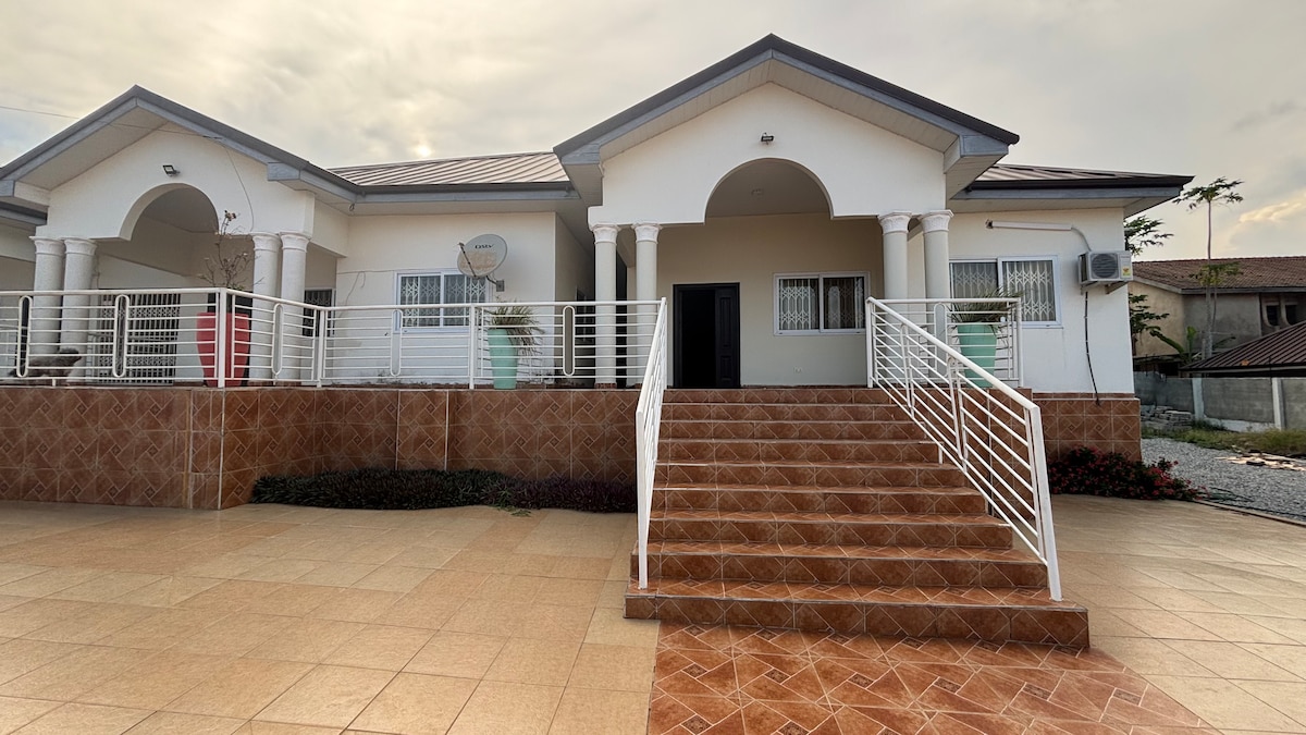 Forget your worries in this spacious and serene space.Located in a very popular and central location in Accra, Gbawe. We offer you extreme value for money with this ultra modern home where you can get away with friends and family for both work and relaxation. Only about 15 min drive to West Hills Mall and bout 30 min drive from the Airport. Come to E&T Villa and let’s create memories together. The road leading to our home is a bit buggy but the comfort that awaits you will make it worth it.