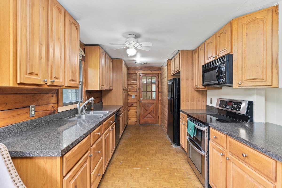 One of a kind fantasy cabin inspired by ACOTAR, that whispers of Prythian & the cauldrons magic. 2 cozy themed bedrooms await w/queen beds, plus a third sleeping loft reached by ladder, crowned with a king-size bed & couch/Futon in living room for lingering dreams in moonlight. Surrounded by nature yet moments from revelry & nite life. Fire pit & grill under the stars + massage table. Kayaks to glide our nearby creek. For couples, magical gatherings, families with older kids & solo retreats.
