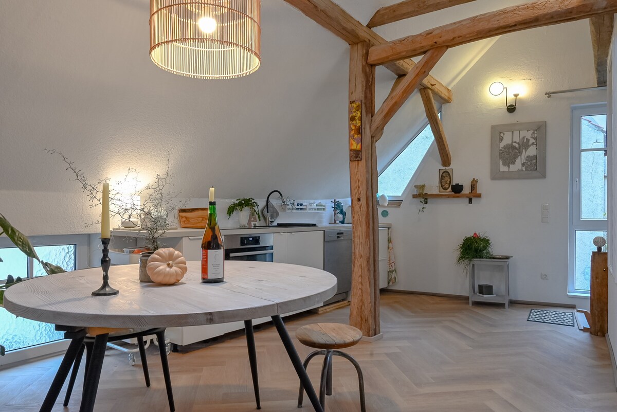 Cozy attic apartment at the foot of the castle in the heart of the old town of Wertheim in the immediate vicinity of the Kilianskapelle and Stiftskirche. The marketplace is about 50 m away and all shops and restaurants are within easy walking distance. There is a parking place available in the immediate vicinity. There is a ground-level bicycle cellar (4 steps) for bicycles. E-bikes can be stored and charged free of charge.