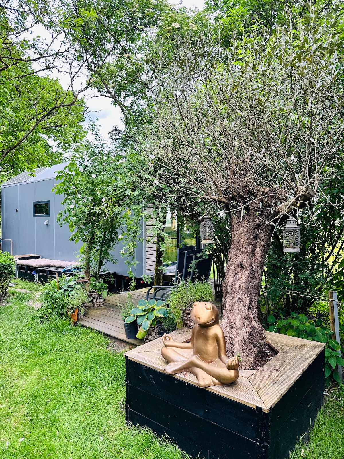 Stylish barrier-free tiny house with view of the countryside. It is located on a quiet side street with ample parking. Super comfortable bed (160 × 200). Large TV (Netflix, Prime), Wi-Fi available, fully equipped open kitchen with round table and two seats. Coffee maker, toaster and kettle available. Bathroom with walk-in spacious rain shower. Towels and a hairdryer will be provided. An outdoor area with seating and barbecue area is available.