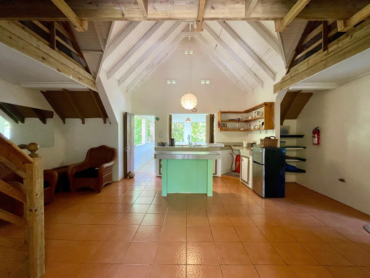 As seen on "10 Most Affordable Caribbean Destinations" Handcrafted, treehouse-style hillside cottage for up to 6 guests Conveniently located Panoramic sea views Surrounded by nature Upper Level Studio: The primary living space with Queen & single bed, ensuite bathroom, kitchenette, open-air lounge Lower Level: 2nd bedroom with Queen bed & optional IKEA cot, ensuite bath & large sundeck Ideal for couples, friends & family