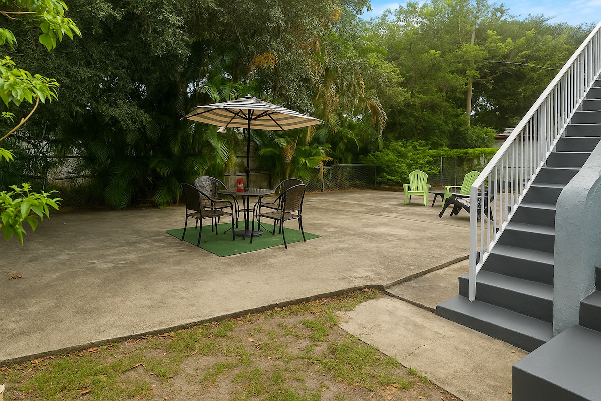 Step into your private oasis—where serenity meets charm. A gently swaying hammock beneath whispering palm trees invites you to slow down and soak in the calm. Tucked among lush greenery, a rustic metal bistro table sets the scene for dining under the stars. Whether it's a quiet morning coffee or an intimate alfresco dinner, this tranquil retreat offers the perfect backdrop for relaxation and unforgettable memories.