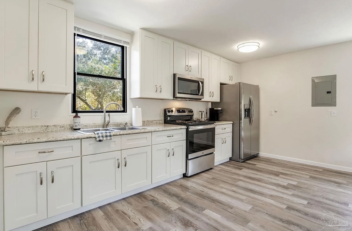 Welcome to our renovated 1950s carriage house, tucked privately behind our home in East Hill. Steps from scenic Bayview Park with paddle boards, canoes, and bikes for rent, and a short ride to bars, breweries, and restaurants on 12th Avenue. Historic downtown Pensacola offers shopping, dining, and live music at Vinyl Music Hall and performances at The Saengar Theater. Plus, the stunning white sands of Pensacola Beach are a short and stunning drive away.