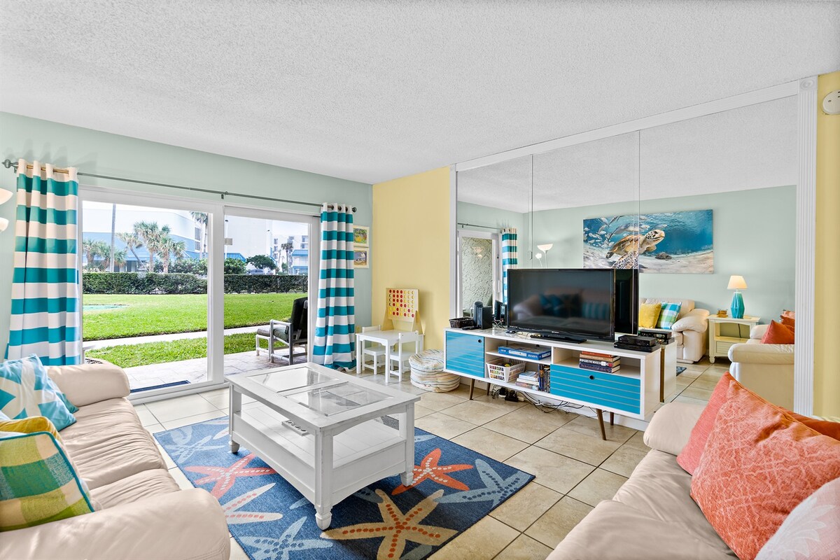 SMOKE FREE NO SMOKING FIRST FLOOR ENTRY makes rolling in luggage a breeze! 2 bedroom beachside getaway @ Cocoa Beach. 3 minute walk to put your toes in the Atlantic at the end of the street. Residential neighborhood, quiet hours 10p-6a, designated parking spot, footwash & coin laundry. Enjoy Florida sunshine & flowers, beach, sea air, SpaceX Rocket launches. Prepare refreshments & meals in the super clean kitchen & enjoy common areas. YOU DESERVE IT!