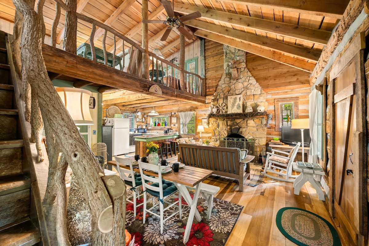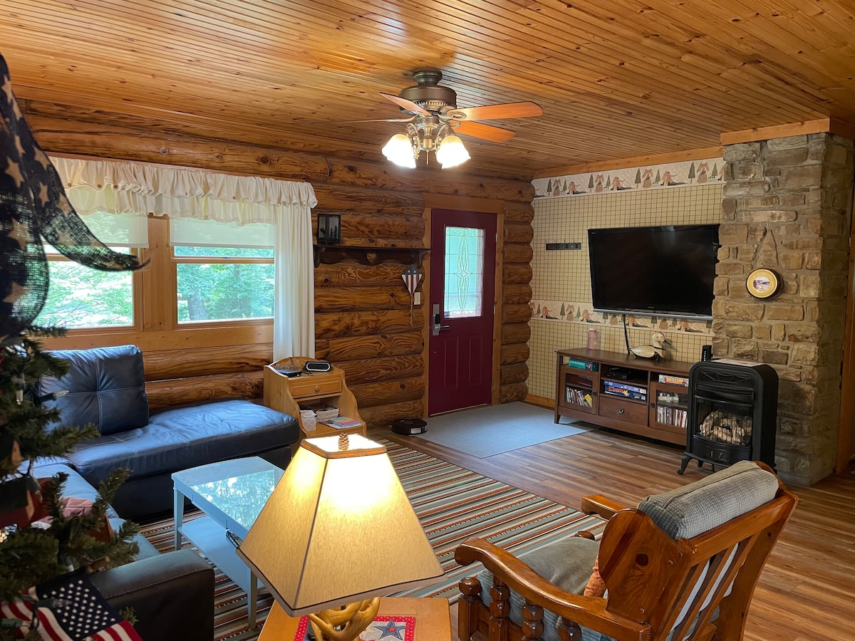 As you walk in, The Cabin wraps it's arms around you and says " Welcome home." You can feel the stress leave you as you settle in for your stay at this scenic cabin on 9.8 wooded acres. Fully furnished, spacious 1 room cabin with stone wood burning fireplace, equipped kitchen, bath with shower and twin over queen bunk bed. Refresh your mind & soul on the covered back porch overlooking the mature woods. Enjoy watching the abundant wildlife, including turkeys, deer, chipmunks and squirrels.