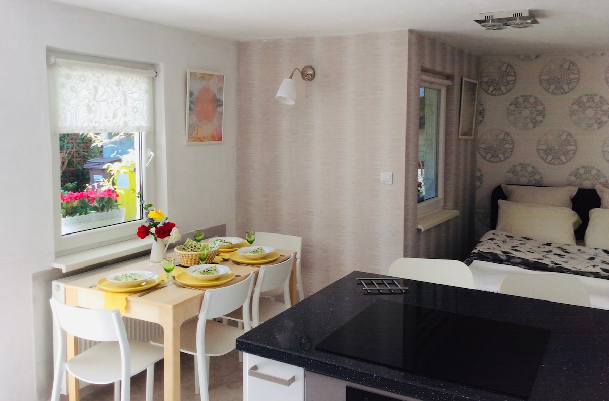Modern furnished, light and spacious studio apartment (open plan with a kitchenette and a dining place) is situated next to the river Vah. Residential area is very safe, fenced and with private parking option next to the house. Location offers calm environment with easy access to the city center - walking distance along the river to the center: 15 mins . Apartment is situated on the second floor, with a balcony. It offers comfort and privacy. No pets, no kids, no smokers.