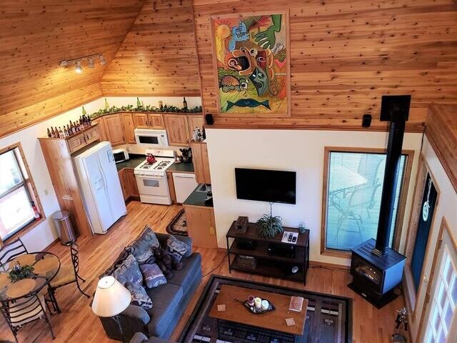 Cow Creek Cabin sits in a peaceful meadow with a gorgeous view of Big Mountain. It is just two miles to downtown Whitefish and 15 minutes to the ski hill. This tranquil Montana setting is an ideal base for adventures in Whitefish. The cabin features vast windows bringing the mountain vista inside. A wood-burning stove awaits your return from a day on the slopes or trails. The kitchen is stocked with everything you need to cook your own meals. The OLED TV is connected to fast Starlink internet.