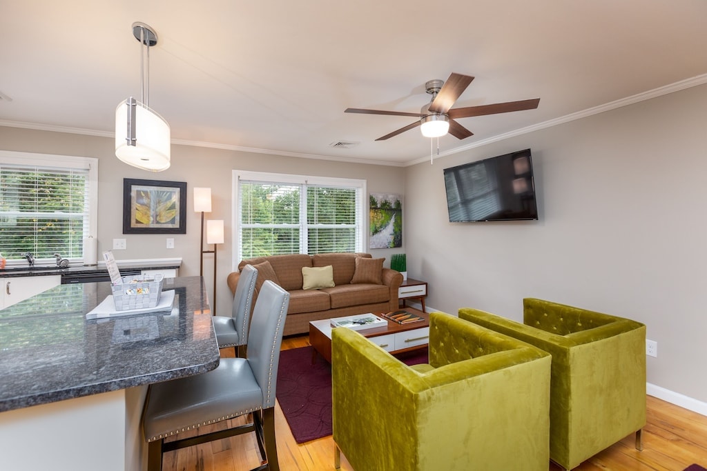 The Flat at Friendly is a renovated 700 sf lower level apartment of a mid-century home-- an easy 4 minute walk to Friendly Center; Greensboro's premier shopping, dining and entertainment destination which neighbors The O'Henry and Proximity Hotels. Features a stylish living room, modern kitchenette, new bathroom and queen bedroom. Keyless entry makes check-in and check-out easy. 5G WIFI Network. Walk to two of the area's most visited outdoor attractions: the Bog Garden and Bicentennial Garden.
