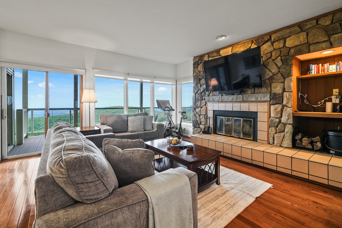 Our warm and inviting condo combines amazing proximity to hiking with to-die-for views of the Blue Ridge Mountains and the horizon 75 MILES distant! Our condo sits a mere 400-yd walk from the closest hiking trail and also has direct access to the ridge line walking area - perfect place for a morning stroll! This updated and modern mountain themed space features: ✸ Newly renovated! ✸ Stocked modern kitchen! ✸ Two full bathrooms! ✸ Helix Hospitality Mattresses!! ✸ Cozy Fireplace w/ wood provided!
