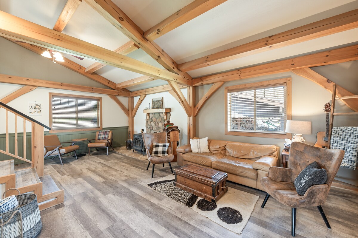 Alpine Woods features a long driveway set back in the woods for a private feel. The cabin's open floor plan and high ceilings throughout make it feel spacious. The large backyard is great for outdoor games, socializing and relaxing. In winter the plowed, flat roads make for easy driving. Ski-in, ski-out access. Great location, close drive to North Cascade trails, Mazama (3.5 miles), Winthrop (11 miles) and the Methow Valley Community Trail and suspension bridge within walking distance.