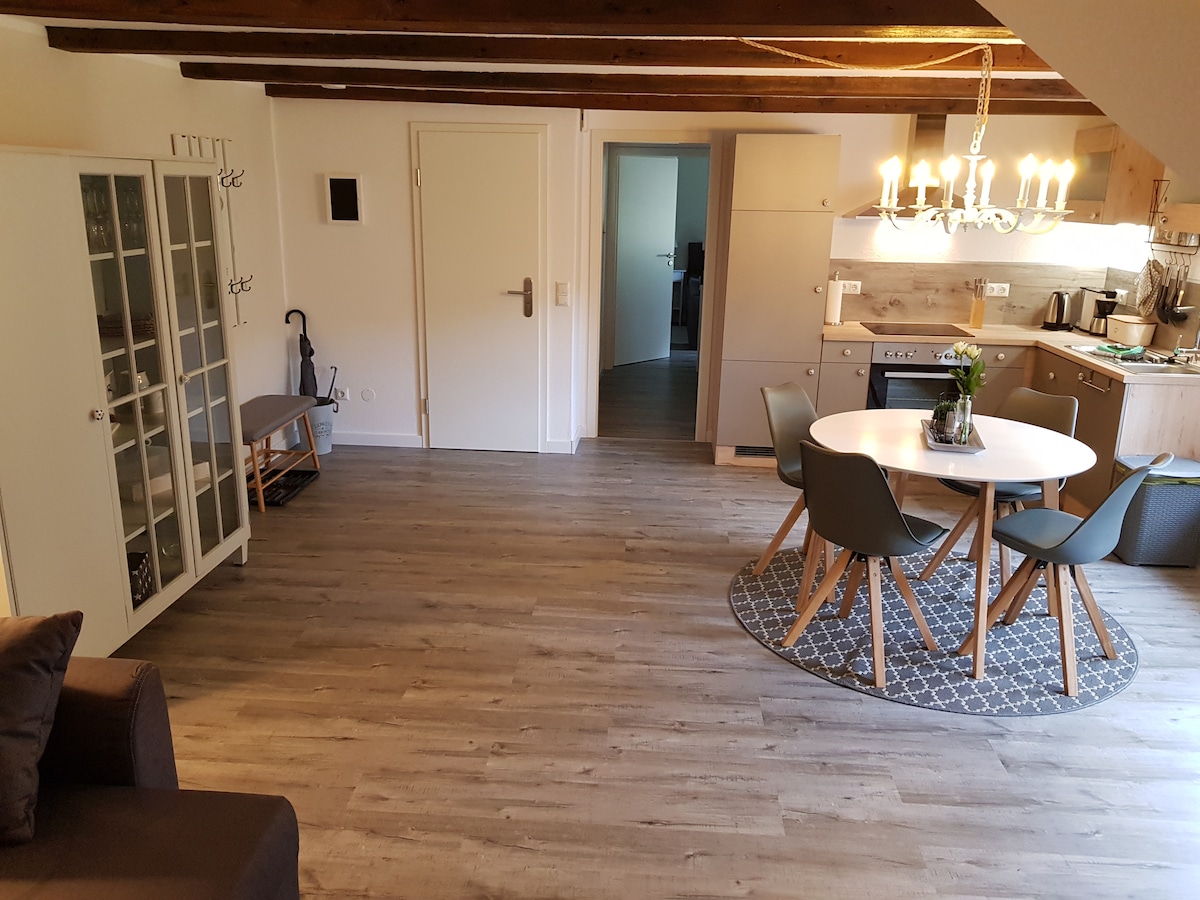 Sunny, large garden, family-friendly and fireplace: The beautiful apartment in a converted barn is ideal for people looking for peace, exercise and nature. You can make campfires, go on bike rides or sit in the dormer and enjoy the unobstructed view over the garden and pastures. A beautiful lake can be reached by bike. Wi-Fi (about 23/7 MBits) and a washing machine are available as well as two private entrances. The sauna costs €10 for 2 hours, each additional hour €5.