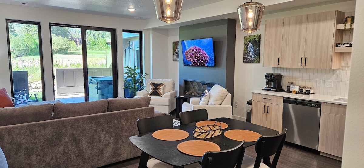Enjoy your own private hot tub. This 1 bedroom condo in Eden, Utah, located right on the 10th hole of Wolf Creek Golf Course & minutes from 3 ski resorts. Perfect for 2 guests, but can accommodate 4, this retreat features a warm living area with a gas fireplace, a Smart TV, and stunning mountain views. The fully stocked kitchen has everything you need, while the bedroom with a king bed offers restful comfort. Enjoy the private patio with a 3 seater hot tub & outdoor seating & fire pit.