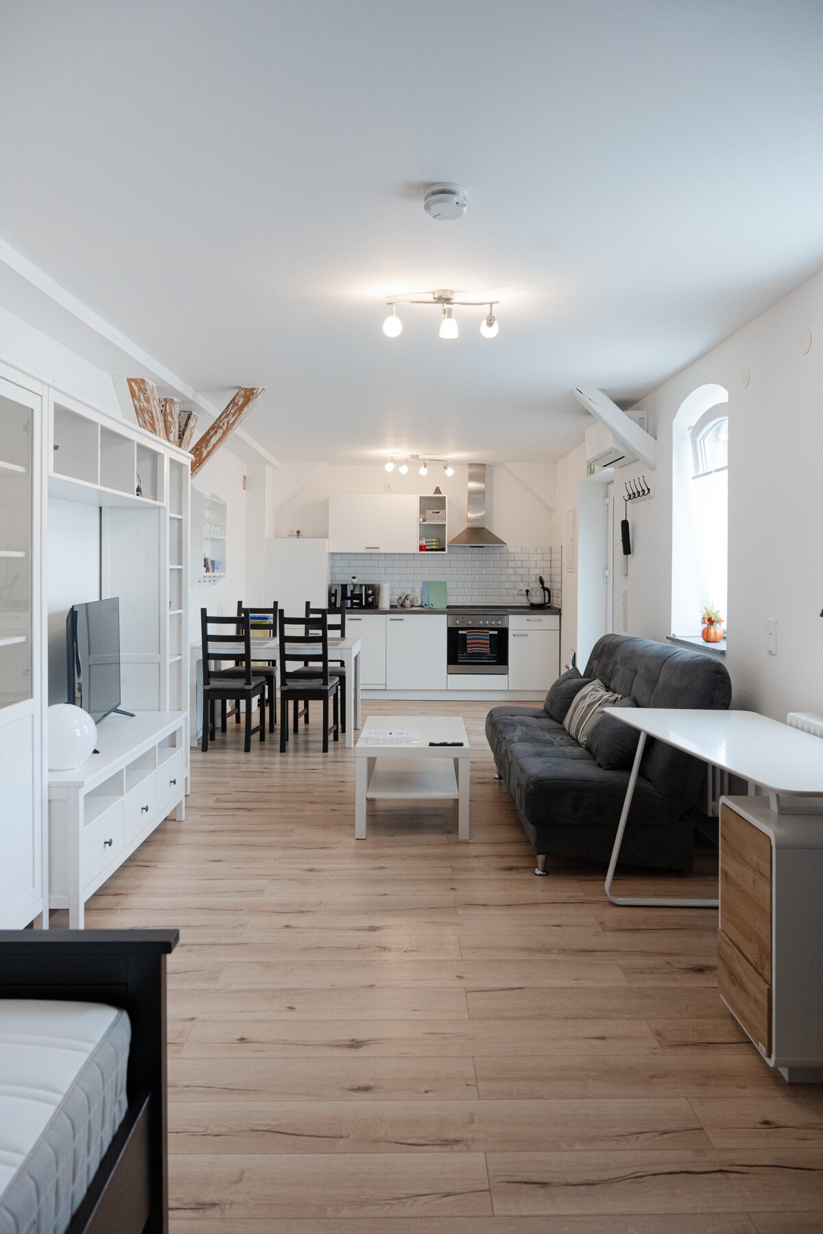 We offer you a bright, cozy apartment in the city center in the shadow of the venerable Trinity Church of Wolfenbüttel. The apartment is newly renovated and includes a living room (sofa bed) and bedroom (double bed 1.40 x 2.00), bathroom and kitchen. The apartment is on the 2nd floor. This is located in a half-timbered house from the 17th century. century on Landeshuter Platz. (Corner house) The train station is about 10 minutes to the bus 5 minutes The courtyard and garden are available!