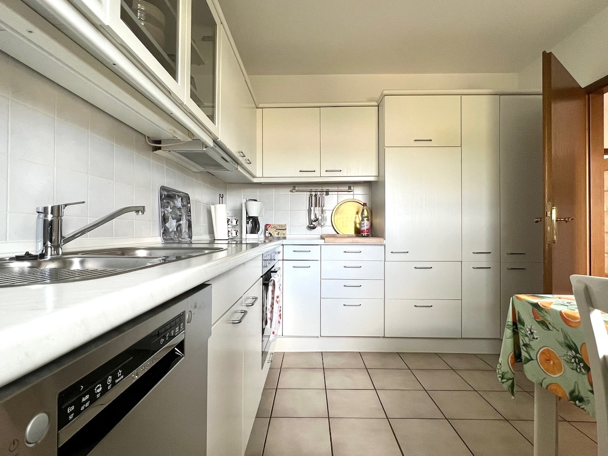 Welcome to our stylishly renovated top floor apartment in a quiet location in Wörrstadt! Look forward to a light-flooded 85 m² with two cozy bedrooms and double beds, a modern IKEA kitchen, a renovated bathroom and an optionally usable living room with a sofa bed – ideal for 4 to 6 people. Perfect for families, couples or business travelers. The vineyards, the outdoor pool, Mainz and Alzey are close. Wi-Fi, smart TV, a parking lot and supermarkets within walking distance.