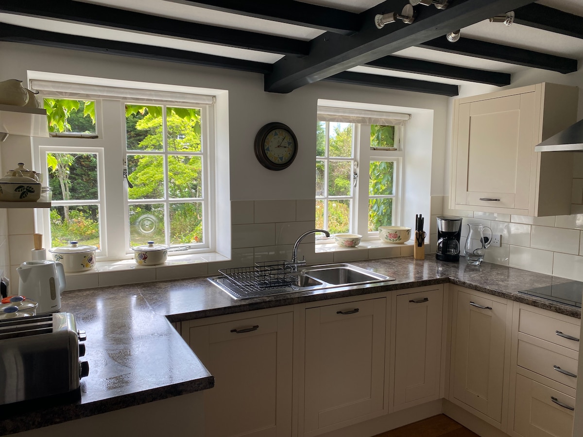 A beautifully converted chapel. Bright, spacious and lovely views from gallery, also a peaceful workspace. Wi-Fi. Pineapple Room with kingsize bed. Jungle Room twin beds or king. Lovely bathroom with shower over bath. Spacious family room with fully equipped kitchen, dining and lounge. Downstairs cloakroom. Designated onsite parking for one car. Enclosed garden ( access across car park through gate signed The Old Chapel Garden). Two housetrained dogs welcome, MUST book. No puppies.