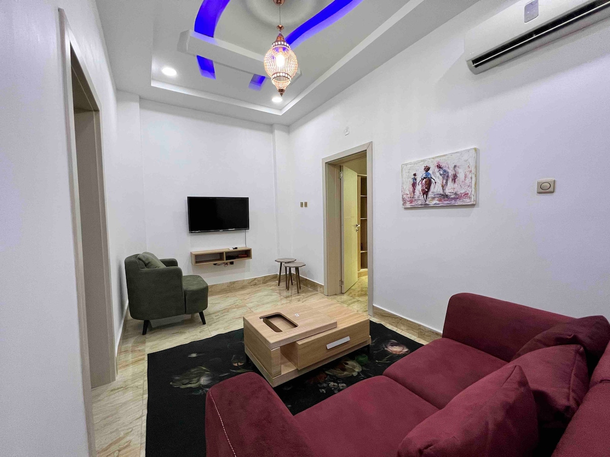 Classy, Clean & Secured 1Bedroom Flat. Smart Tv in Living room and Bedroom plus YOUTUBE, PRIME etc Free Fibre Optics WIFI-very reliable. Stable Electricity Supply Plus 24hours Standby Generator that powers Every Appliance. Ready to use Kitchen with Utensils. No Smoking. 2 Guests max Flat on the First floor. Check in 2pm: Check out 11am. Early Check in before 2pm / Late Check out after 11am have a fee. Very Accessible location Please Read “Things to Note” below.
