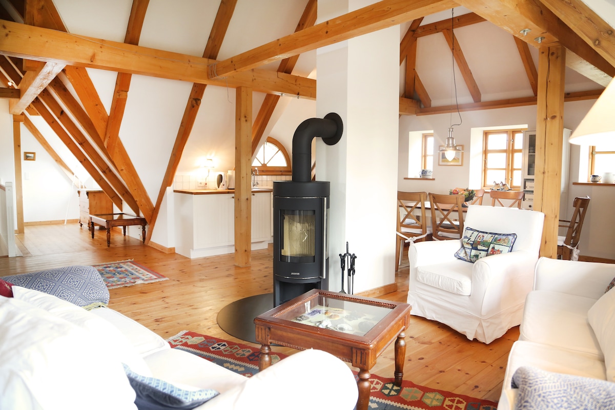 Surrounded only by meadows and fields, hidden behind the village pond, lies the small manor estate with its main house and old stables. For the past five years, we’ve been carefully restoring it, breathing new life into the 1899 estate. On the upper floor of the manor house – a brick building typical for the region – a spacious, light-filled 114 sqm apartment is waiting for you. The old beams are visible once again. The interior is simple and doesn’t distract.