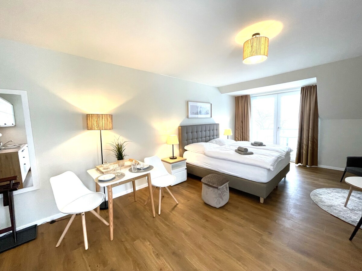Spacious, bright, stylishly furnished apartment, with individual character and breathtaking views of the island of Rügen, Rügen Bridge, as well as the harbor and ships. The accommodation is composed of a living room, open kitchen, bedroom for two people ( ), bathroom with shower, no pets allowed. Small fitness corner available. The apartment has 2 outdoor spaces where you can enjoy your own bottle of wine. Location: Hafeninsel in the heart of the old town, about 30 m from the waterfront.